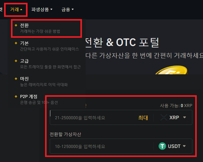 상단의 거래 탭 -> 전환 -> 에서 화폐를 XRP로 맞춘다음 전환할 가상자산을 USDT로 바꾸면 된다. USDT는 1달러의 가치를 지니기 때문에 본인이 가진 암호화폐를 일종의 달러로 바꾼다고 생각하면 된다. 이렇게 USDT까지 변환을 완료했다면 본격적으로 선물 시장으로 이동해 매수(롱) 또는 매도(숏) 포지션을 잡아보도록 하자.