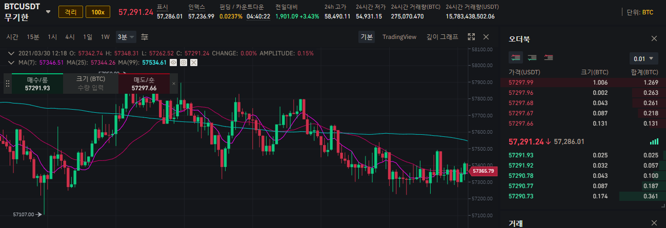 확인해보면 57,348이 진입가격, 57,327이 시장가격, 즉 7달러밖에 차이가 나지 않지만, 손실률은 3.5%가 난다. 즉 7달러가 아니라 *100인 = 700달러의 하락으로 인식했기 때문이다. 100배 레버리지가 아니었다면 -0.035%에 불과했을 손실률. 아무튼 레버리지 거래는 재밌기도 하지만, 그만큼 위험하니 충분히 인식하고 투자할 필요가 있다.